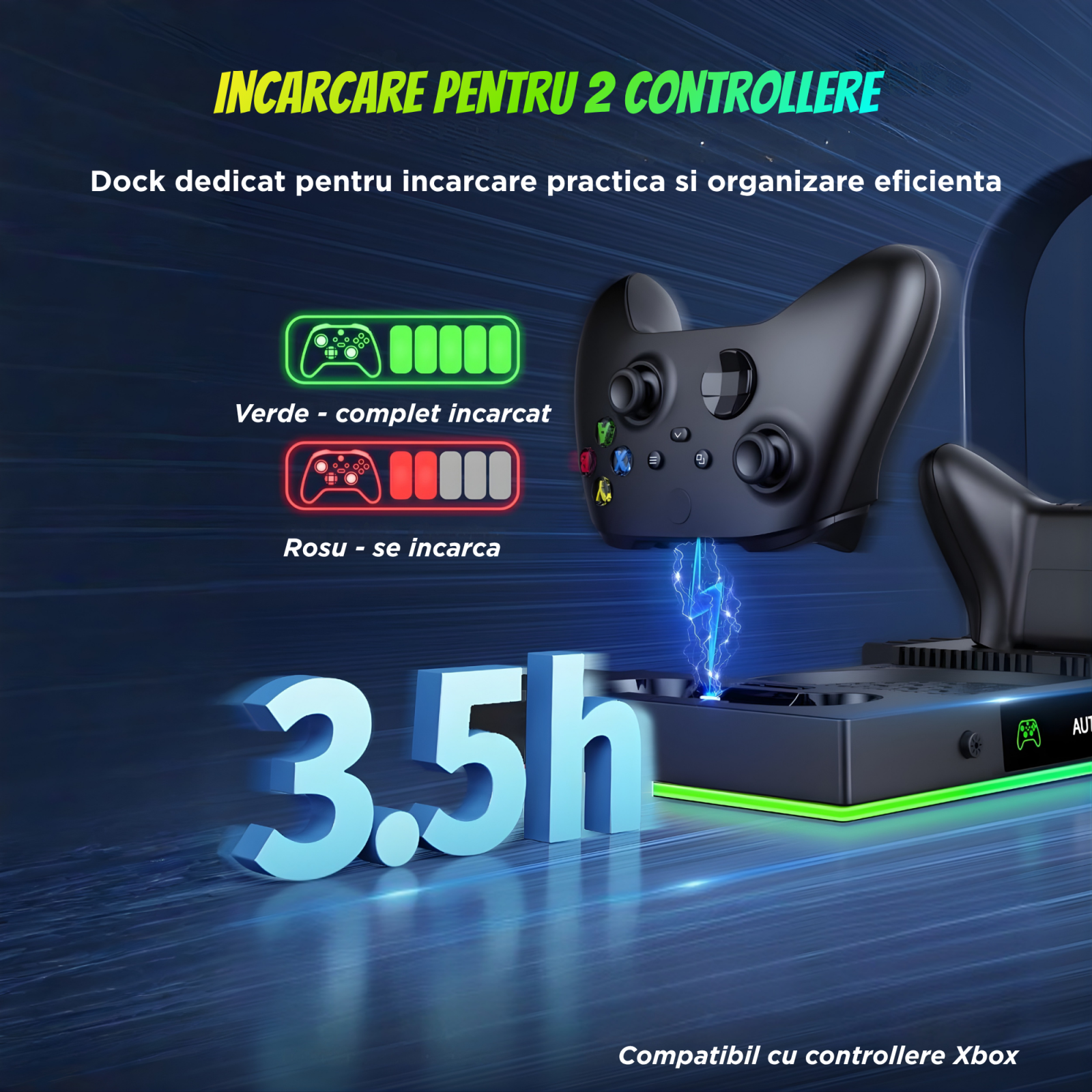 Ajuta la racirea consolei, incarca rapid controllerele, pastreaza castile si jocurile organizate si adauga un plus de stil setup-ului prin iluminarea RGB.